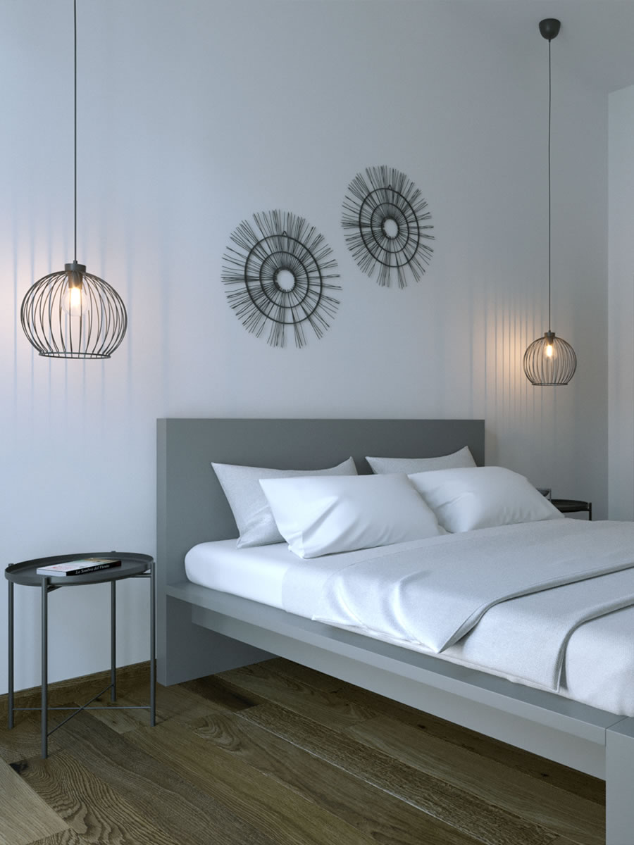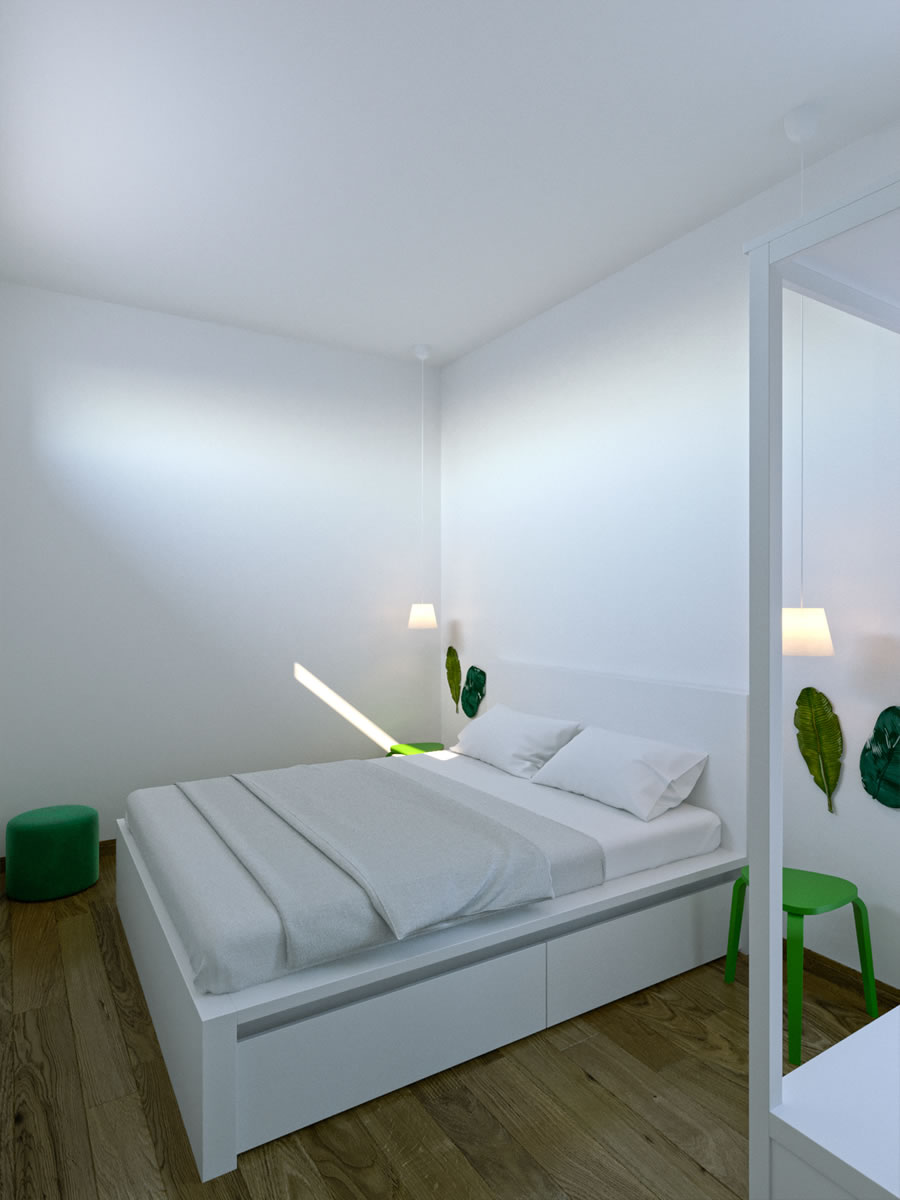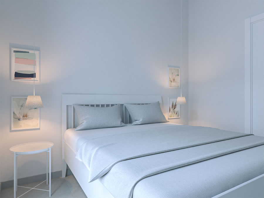 Gli appartamenti dispongono di spaziose camere da letto arredate con gusto, caratterizzate da tonalità neutre che creano un'atmosfera rilassante. Un comodo letto matrimoniale accoglie gli ospiti dopo una giornata di esplorazione dell'isola. Ampie finestre permettono alla luce naturale di illuminare la stanza.